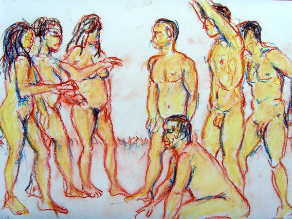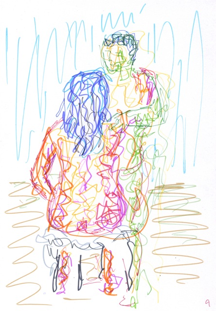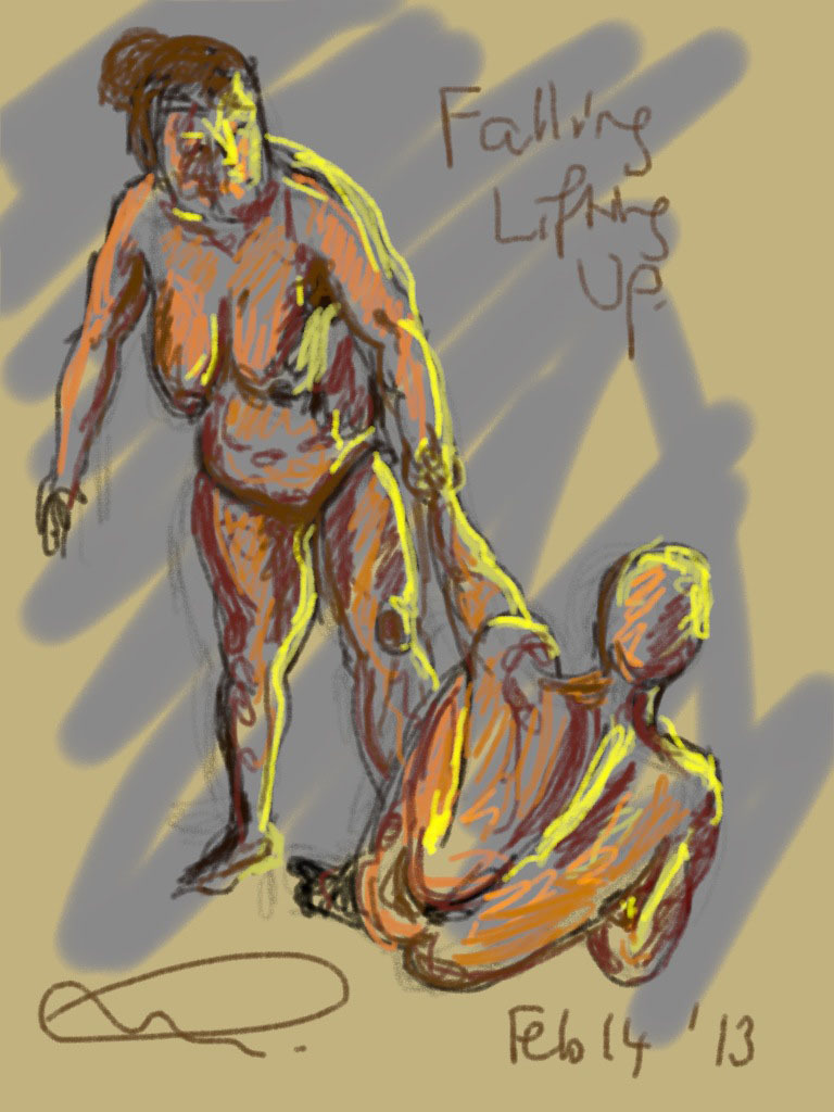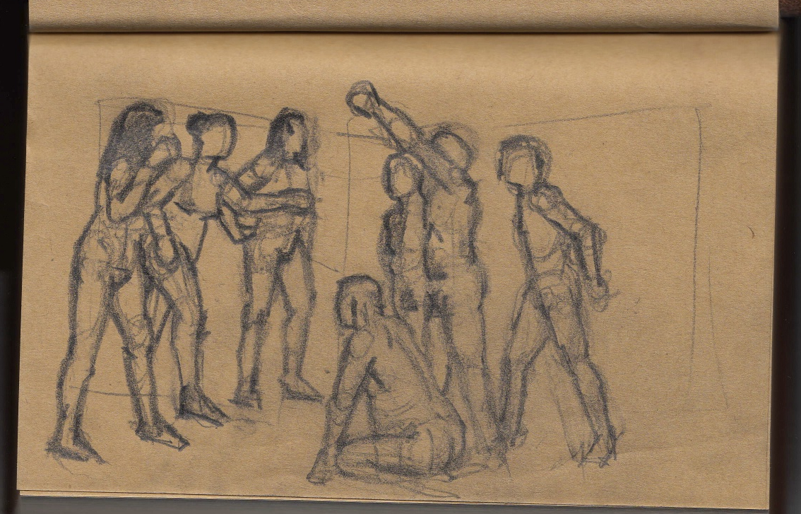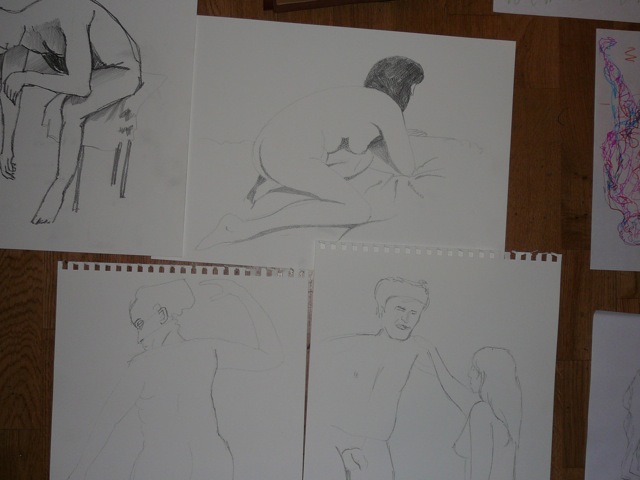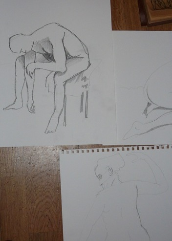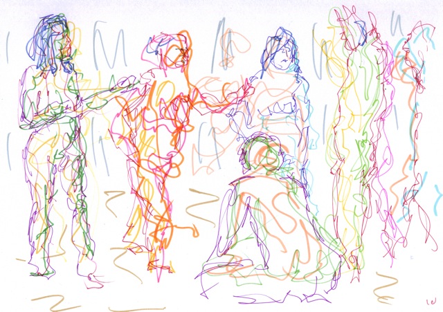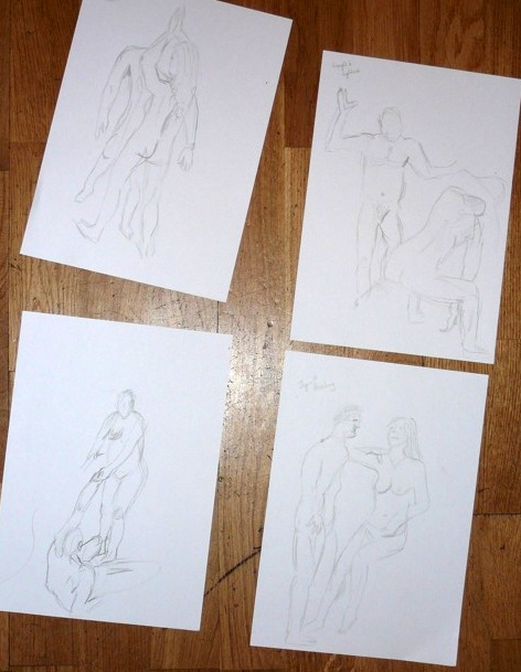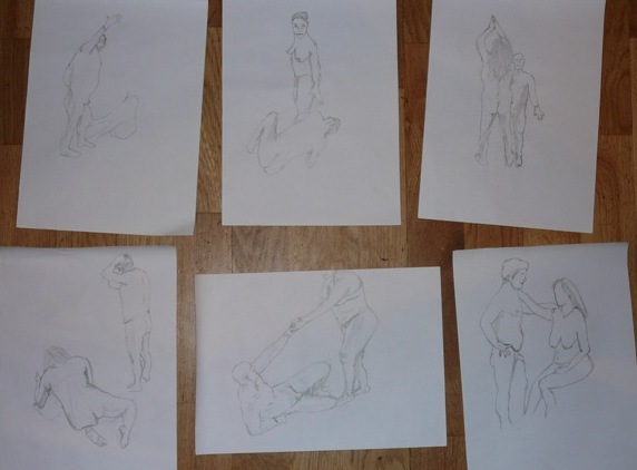 The theme was opposites; expansion & compression with 2 figures, each embodying one of these qualities. Then there was growing and dying, lightness and weight, falling and rescuing. This last match turned out to be 15 minutes of near agony for the models gripped as they were in a tight stretch so I felt more lenient for the next pose. The joy of connecting was the theme so that relaxed and happy expressions were evident. Finally a miniature recreation of Degas’ Young Spartans gave all the models a chance to try a 20 minute pose together. A thoroughly good evening, and as we wound down, the band was warming up in the restaurant above, surrounded by candle lit couples and unusually busy waiters.