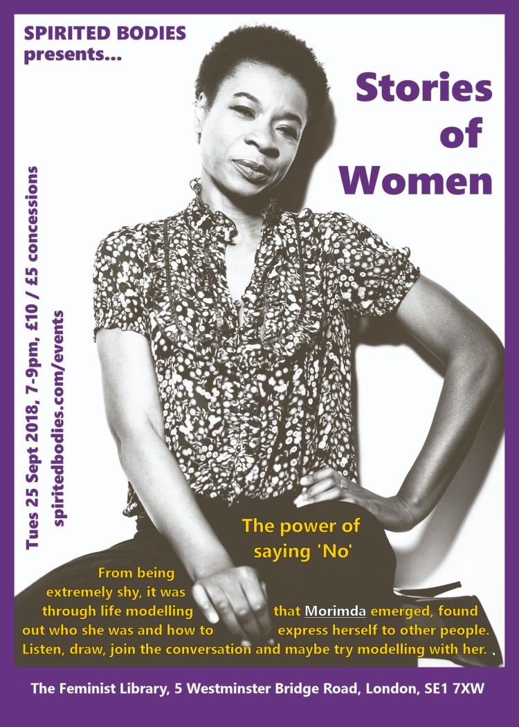 Spirited Bodies presents the next Stories of Women event, featuring co-founder Morimda, a professional life model of over 20 years experience. This will be held on Tuesday September 25th, 7pm – 9pm at The Feminist Library.